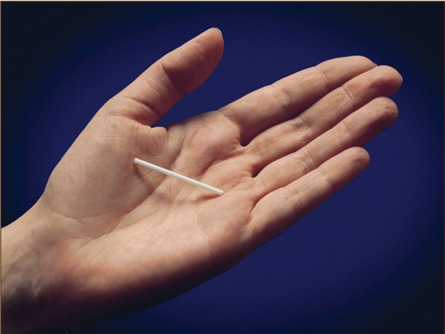 O implante (ilustrado na foto acima) é um bastonete de 4 cm de comprimento, flexível e estéril, que deve ser inserido no braço embaixo da pele. Ele contém em sua composição um hormônio sintético, chamado etonogestrel, que já é muito utilizado nas pílulas anticoncepcionais. Já o DIU é um dispositivo também pequeno colocado dentro do útero. No Brasil temos, o DIU de cobre e o DIU com o hormônio progesterona.